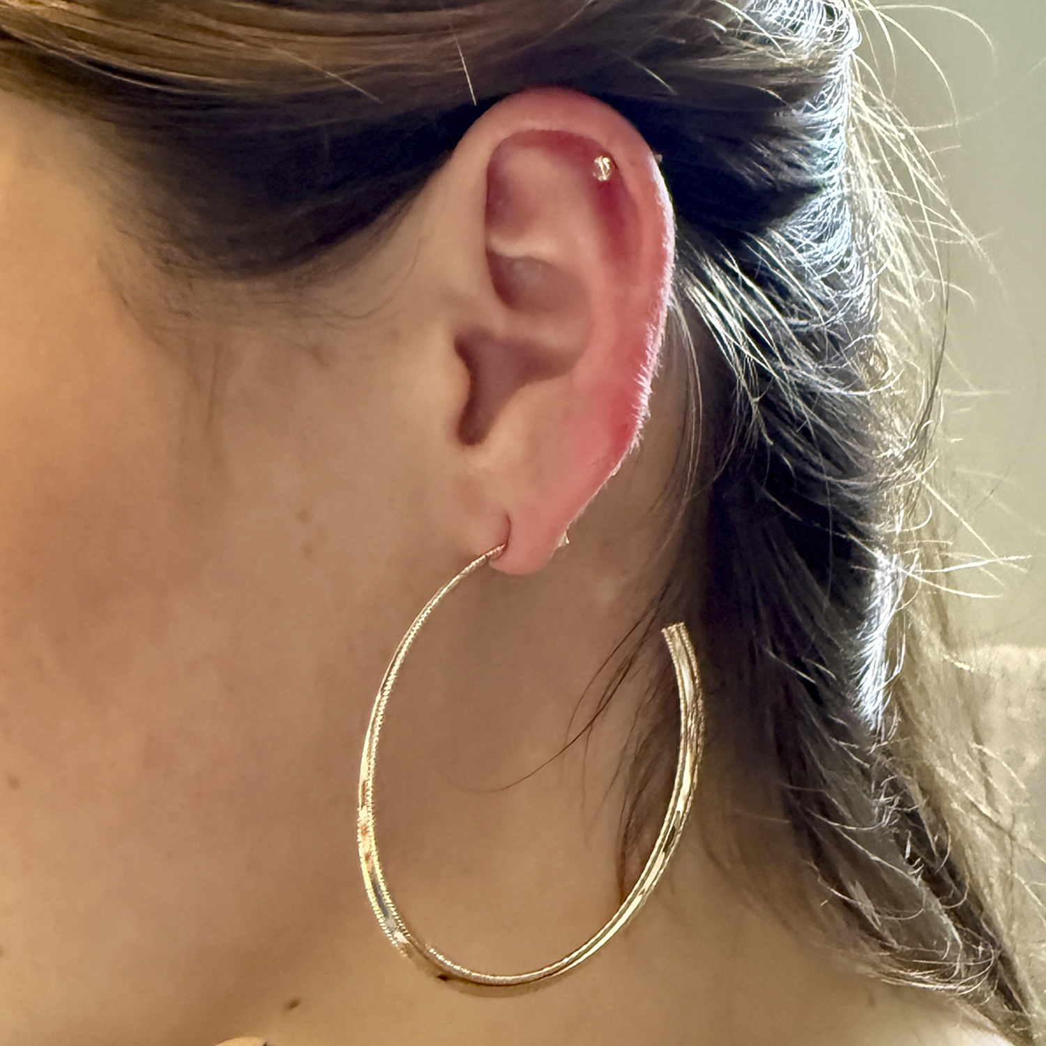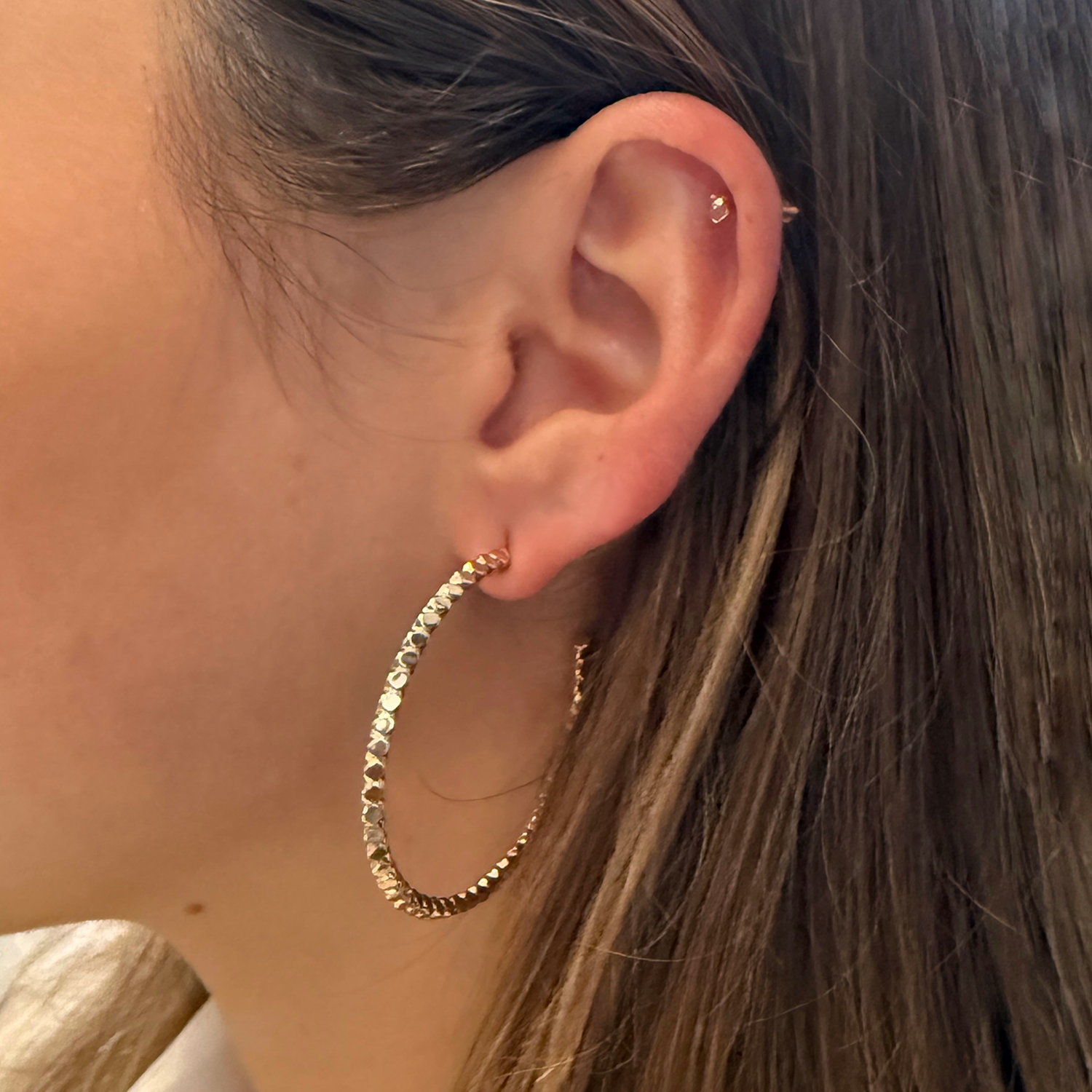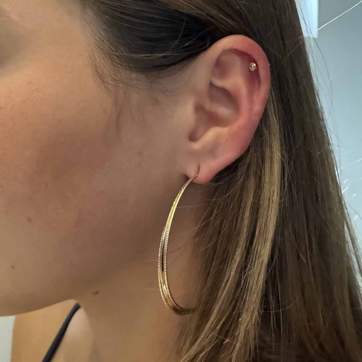 These elegant hoop earrings are made with high-quality gold and sterling silver, ensuring durability and resistance. Their shiny and polished finish adds a sophisticated touch to any outfit. Perfect for daily wear or special occasions.