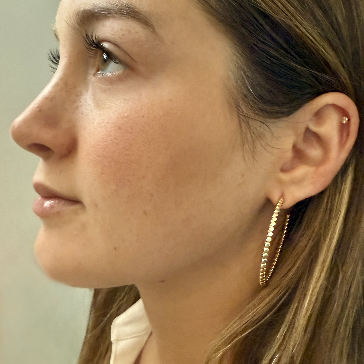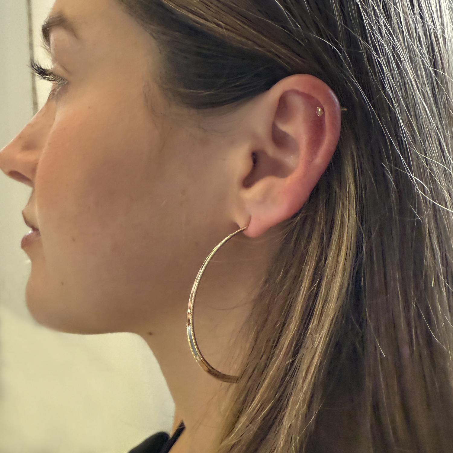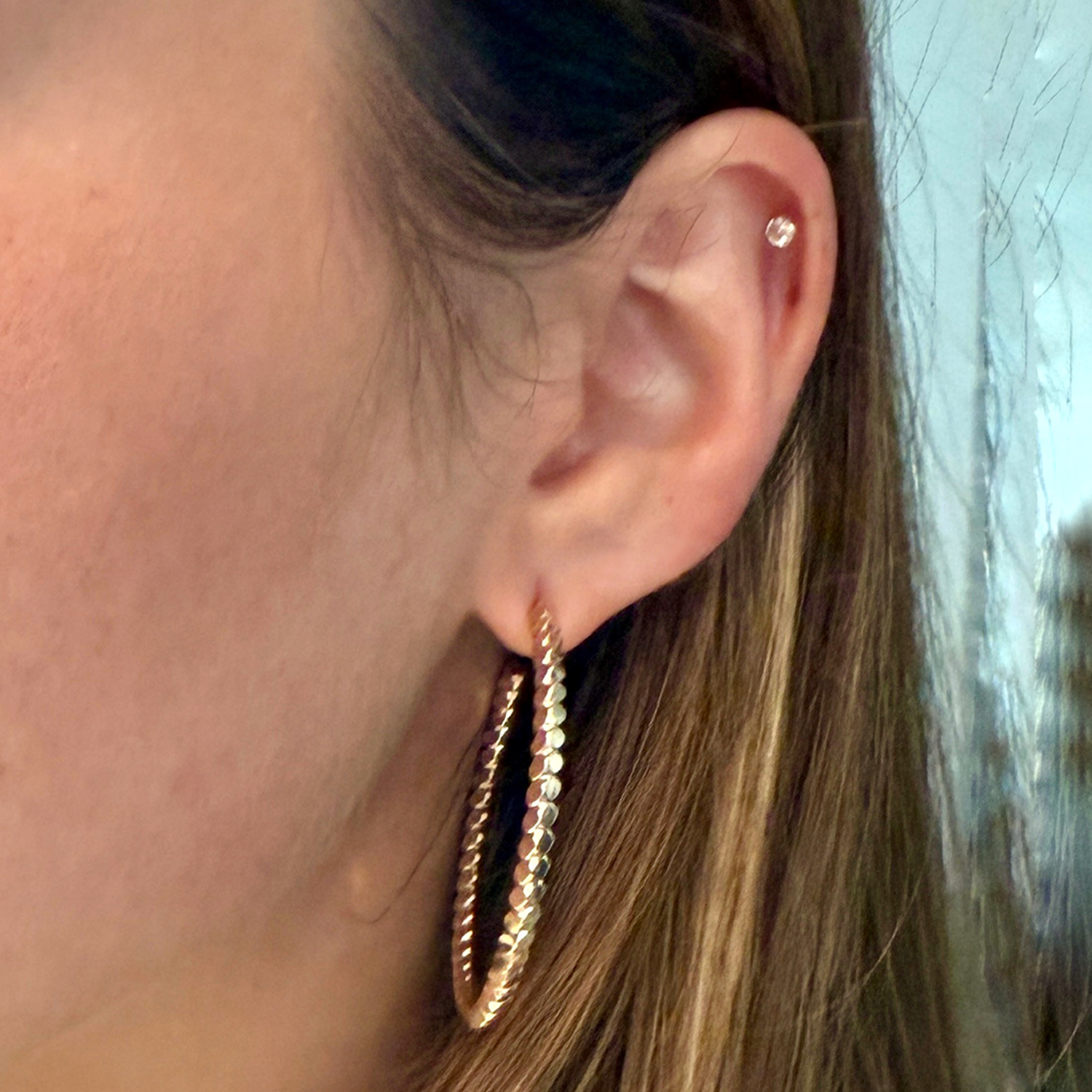 These elegant hoop earrings are made with high-quality gold and sterling silver, ensuring durability and resistance. Their shiny and polished finish adds a sophisticated touch to any outfit. Perfect for daily wear or special occasions.