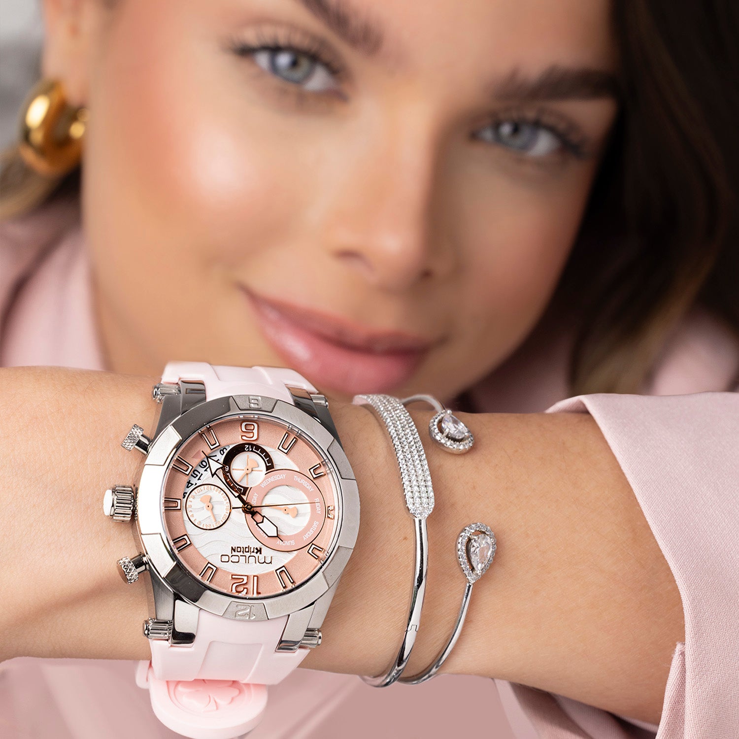 - Display: Textured dial with rose gold accents